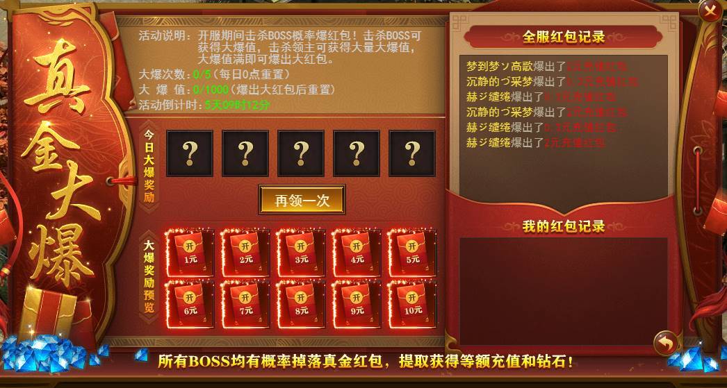 开服活动期间击杀boss概率爆红包,击杀boss可获得大爆值,击杀领主可获得大量大爆值,大爆值满即可爆出大红包。提取充值红包获得等额充值和钻石。