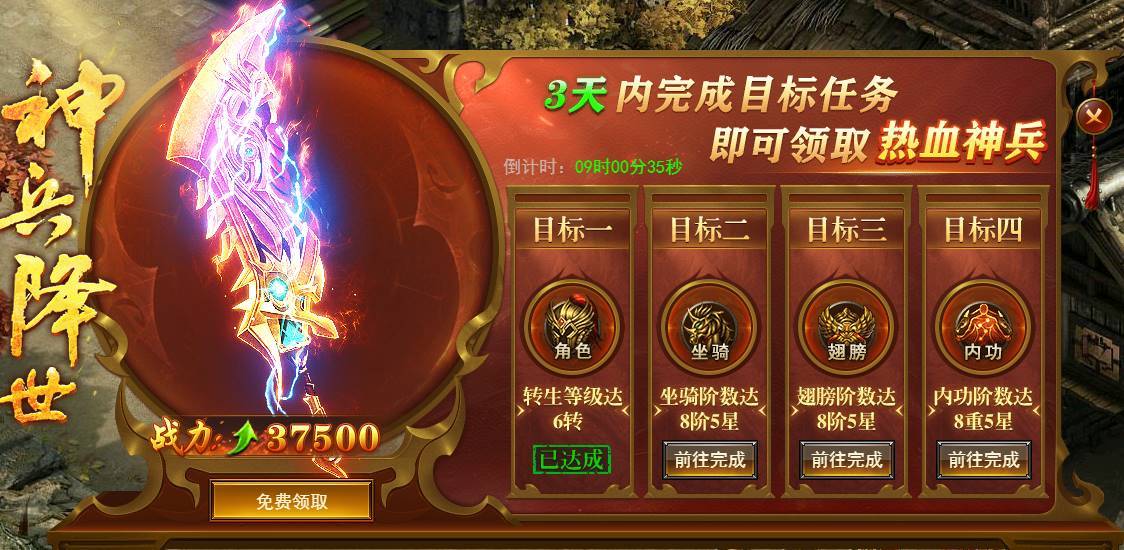 新服前6天每天开启不同的达标活动,活动持续6天,完成达标即可领取丰厚奖励。