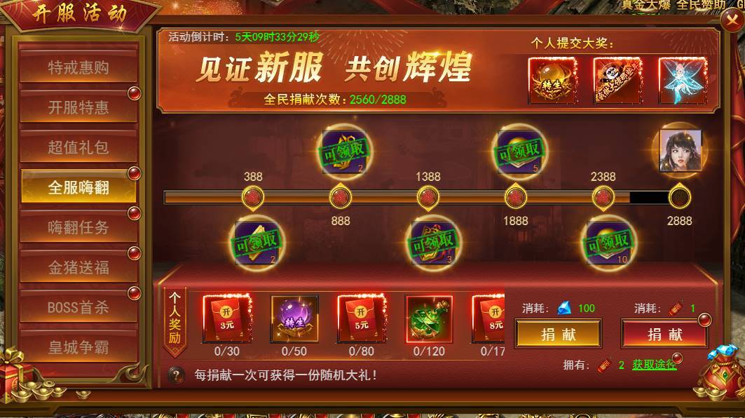 有捐献可获得个人奖励和全服奖励,每捐献一次可获得一份随机大礼。可直接钻石捐献,也可完成嗨翻任务获得欢庆烟花捐献。