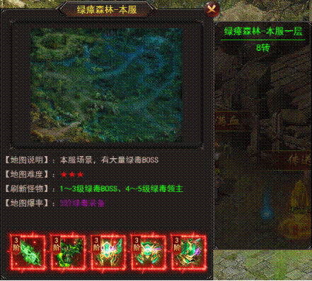 毒障森林【本服一层】:8转可进,1-3级绿毒BOSS,4-5级绿毒领主