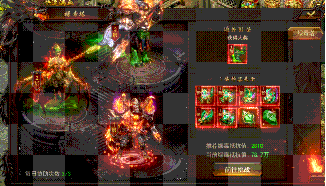 绿毒塔封印着大量蛮荒绿毒boss,挑战绿毒塔且通关后可以获得绿毒装备、绿毒材料等大量奖励,能邀请/协助其他通过的勇士协助通关