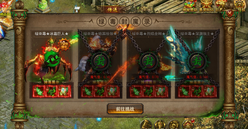 绿毒BOSS死亡后全服可积攒气值(魔气值统计全部玩家),达到一定魔气值后可以开启封魔录BOSS,BOSS次数每天重置。