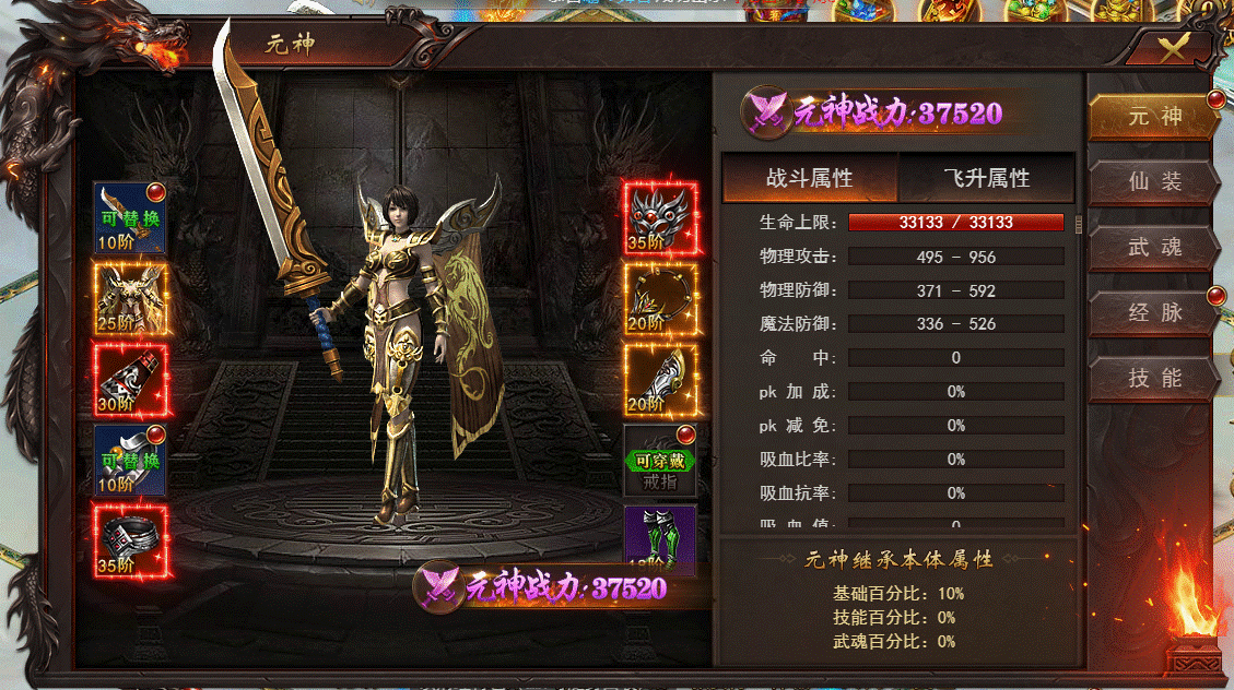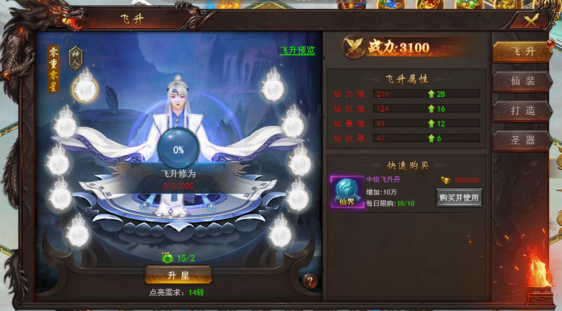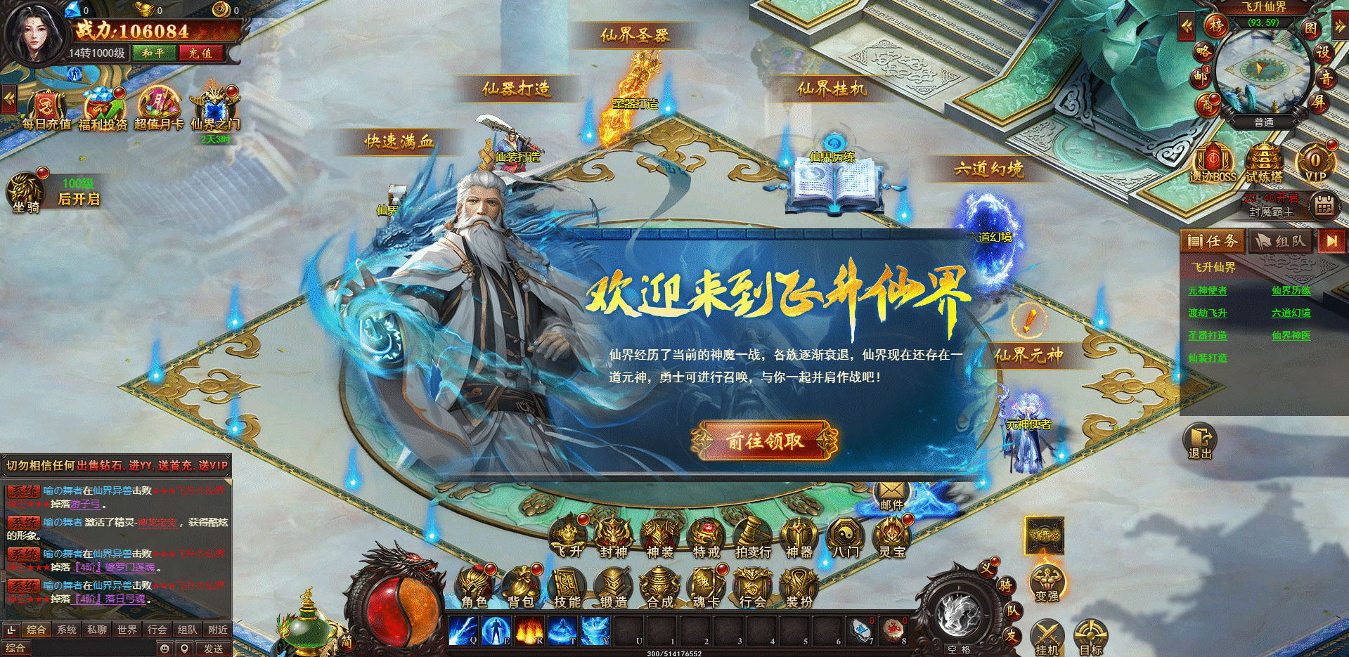 飞升仙界玩法内容模块:仙界之门,飞升仙界主城,飞升渡劫,仙界历练挂机地图,六道幻境,仙界装备,仙界装备打造,诛仙圣器,元神系统,元神武魂,元神经脉