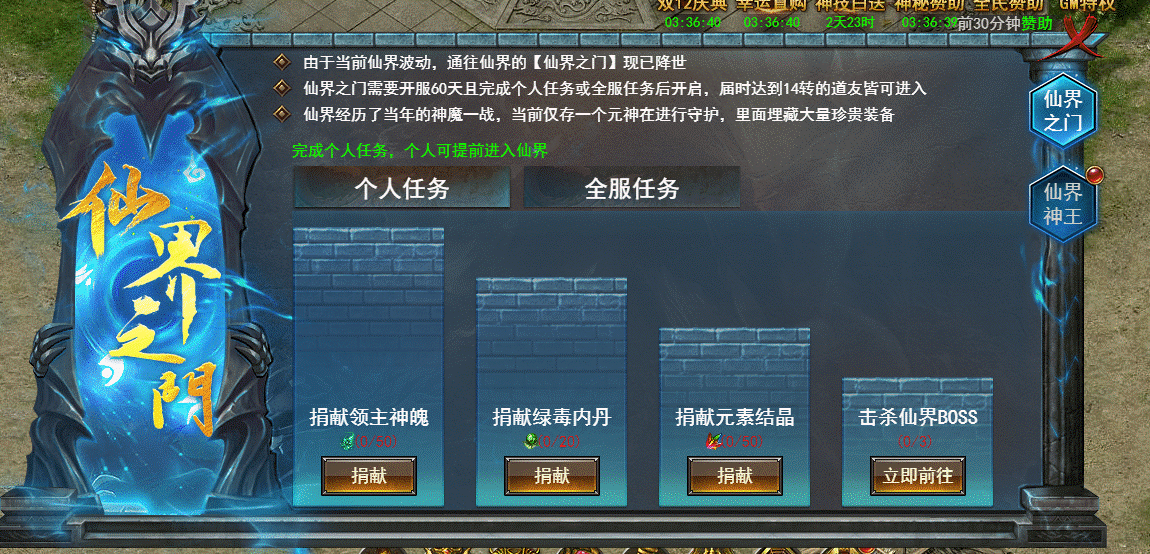 2、优化增加元素大陆免费时间在本服任务面板的显示