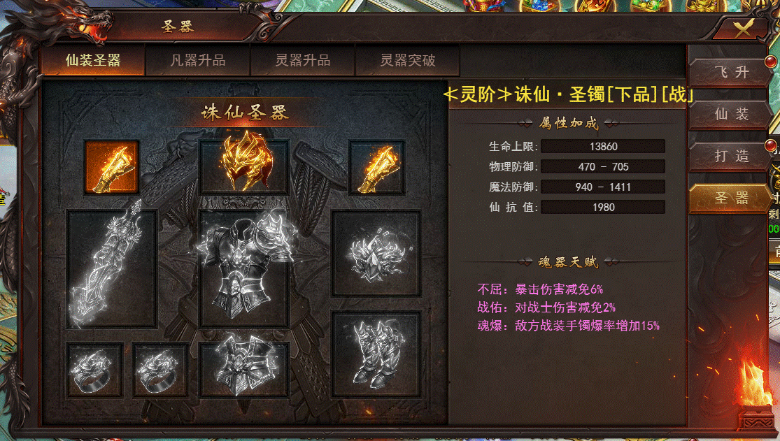 诛仙圣器可与仙装融合,极大提升仙装的属性。
