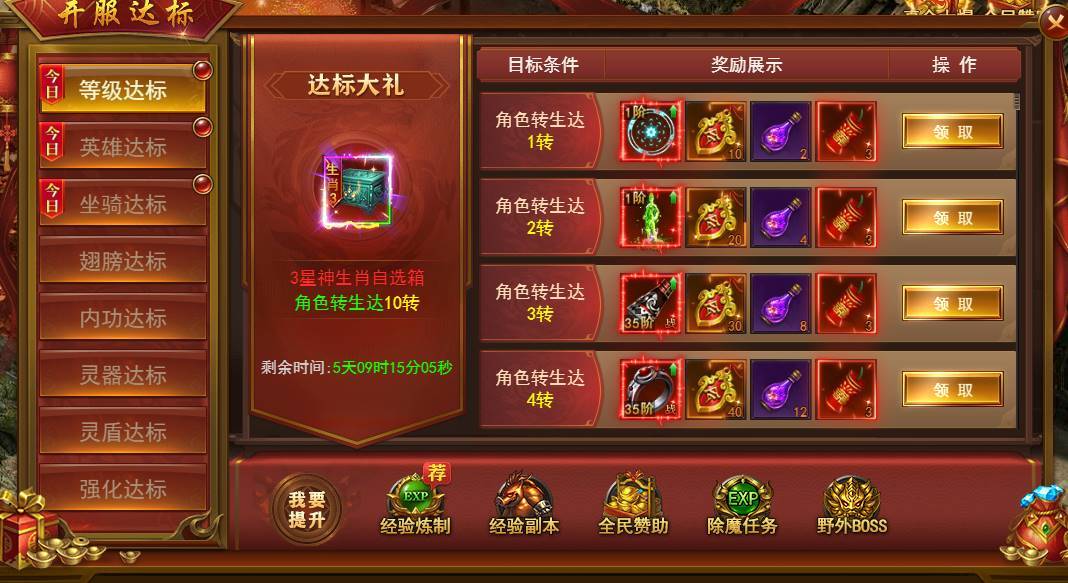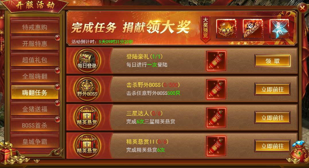 新服前6天每天开启不同的达标活动,活动持续6天,完成达标即可领取丰厚奖励。