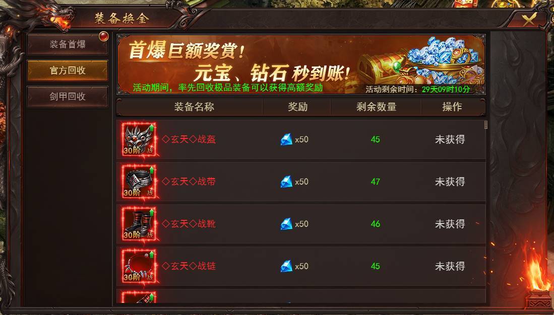 活动期间,率先击杀怪物爆出装备即可领取高额奖励,官方回收剑甲回收更有钻石奖励。