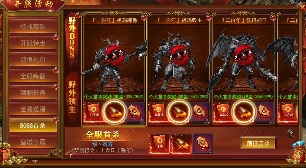 全服首次击杀指定boss即可领取丰厚奖励一份,个人首杀可在领取一份,数量有限,先杀先得。