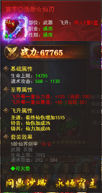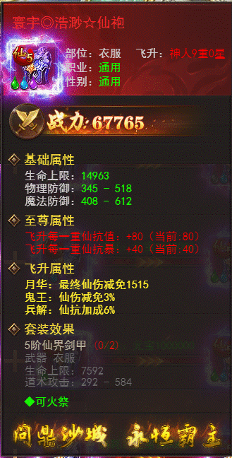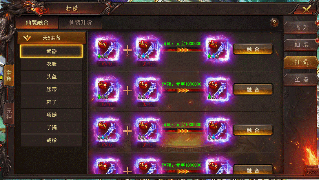 1、5阶以上仙界装备可进行融合,融合后的仙装会获得多词条仙装,最多可获得3条飞升属性