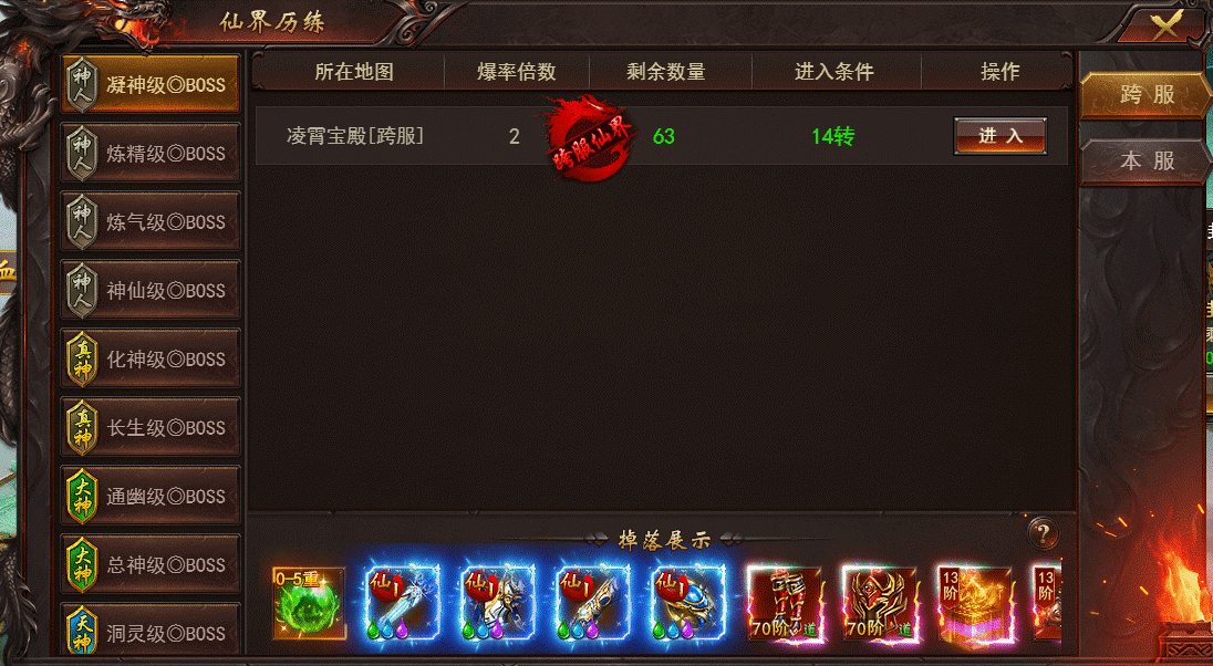 仙界历练包含本服地图和跨服地图,跨服地图爆率更高。