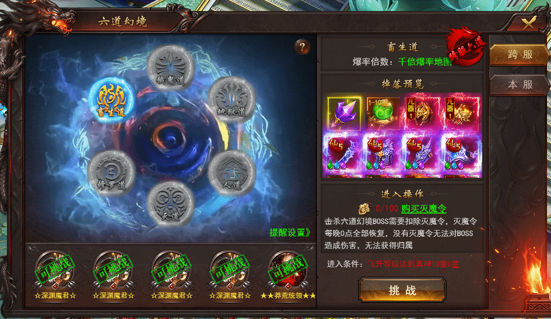 六道幻境包含:畜生道、饿鬼道、地狱道、人道、天道、修罗道。需求飞升境界才可进入