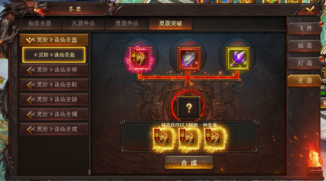 3、2条飞升属性装备+另外一条飞升属性装备可以合成3条飞升属性装备
