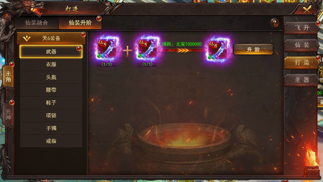 飞升仙界玩法内容模块:仙界之门,飞升仙界主城,飞升渡劫,仙界历练挂机地图,六道幻境,仙界装备,仙界装备打造,诛仙圣器,元神系统,元神武魂,元神经脉